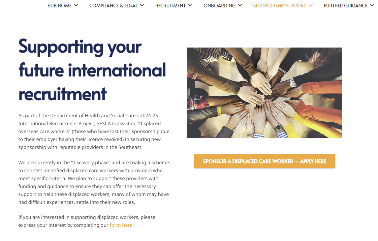 Funded by the Department of Health and Social Care, SESCA has been supporting international recruitment efforts in the South East to help grow the adult social care workforce for the past few years. Their International Recruitment Hub now includes a dedicated Sponsorship Support section for care providers, outlining the new scheme for sponsoring displaced workers.